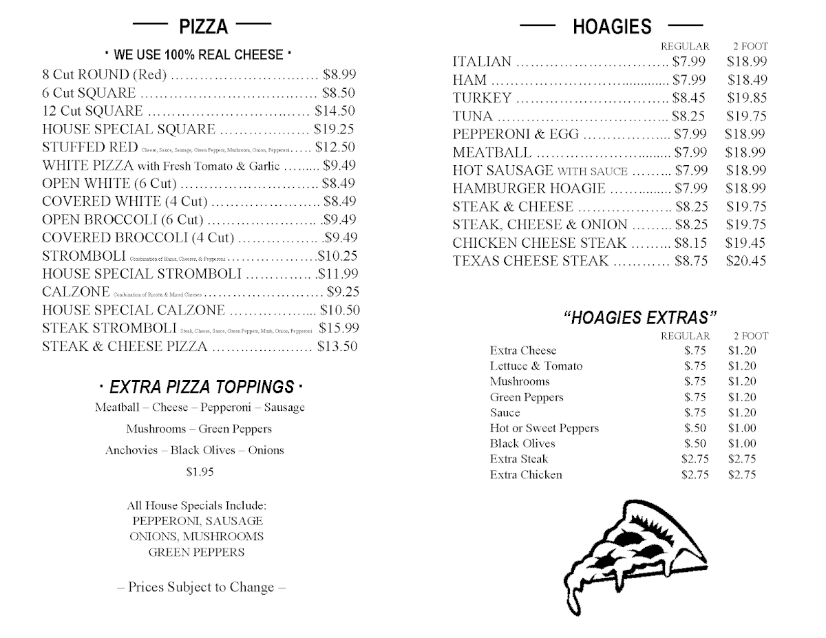 The pizza selection includes both round and square styles, with toppings ranging from simple cheese to a fully loaded house special. Unique offerings like the covered white pizza stand out as comforting choices, especially when you’re seeking something a bit different but still easygoing. Alongside the pies, you’ll find a variety of salads and a lineup of straightforward burgers, rounding out the menu with fresh and hearty options.